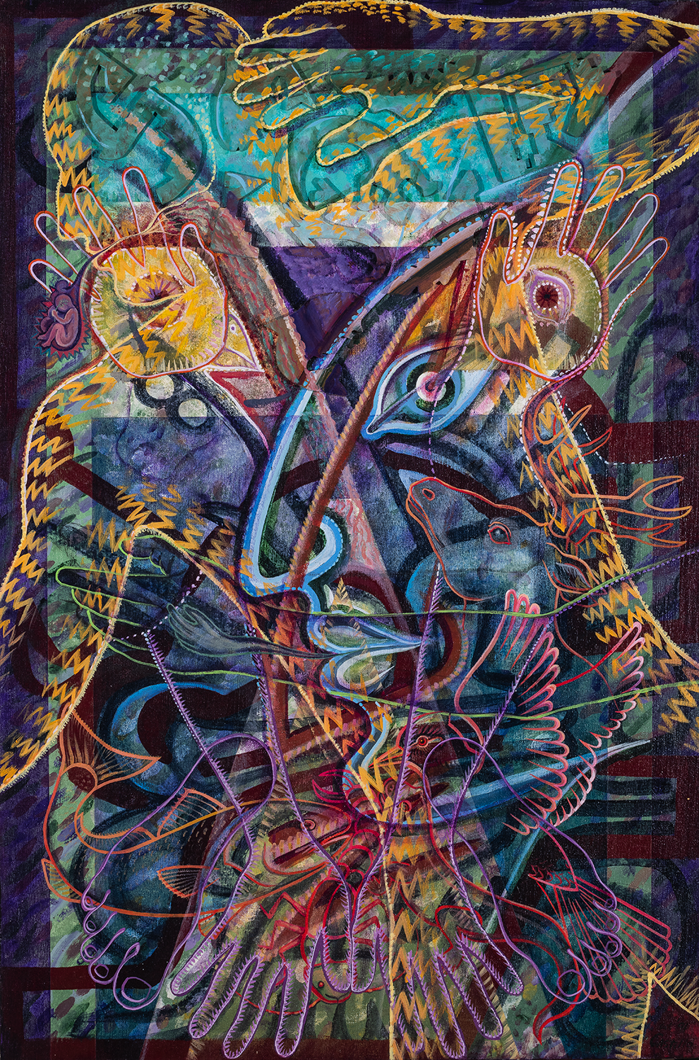 acrylic and mixed media on canvas mounted on wood with wood appliqués / acrílico y técnica mixta sobre lienzo montada en madera con aplicaciones de madera
