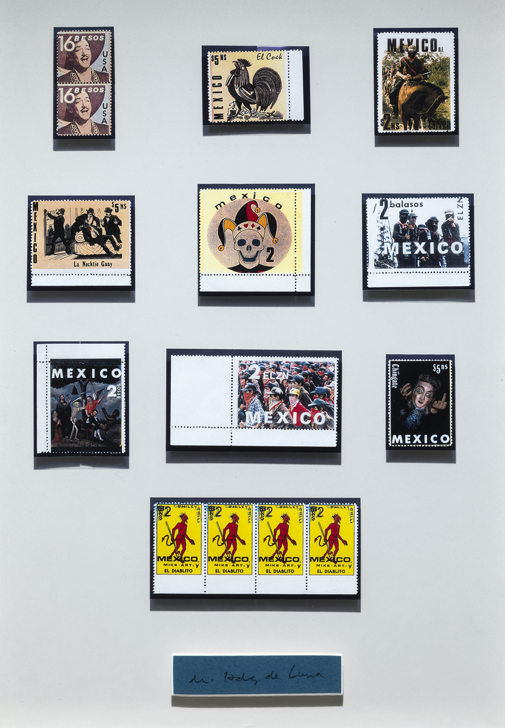 Untitled (collage of 14 fraudulent Mexican stamps) (Sin título [collage de 14 estampillas mexicanas falsas]), various dates / fechas diversas